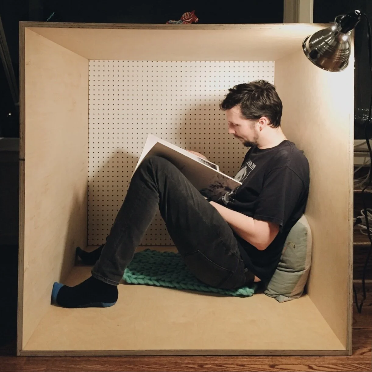 Reading Box One day I had an idea to make a box big enough to sit in and read because I had a hard time concentrating on other things going on around me. I drew my idea on paper, and my husband made it. Now my kids read and play in it.